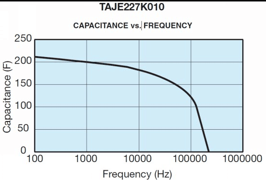 AVX鉭電容隨著頻率的增加有效電容的值會減小,直到共振達到(通常視0.5 - 5MHz的之間該評級)。除了共振頻率的設(shè)備變得感性。除了100kHz的電容繼續(xù)下降。